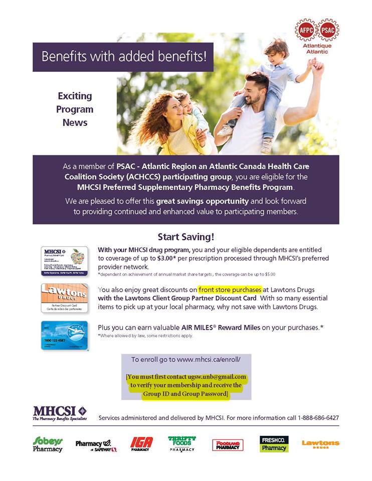 As a member of PSAC Atlantic you are eligible for the MHCSI  Pharmacy Benefits Program.